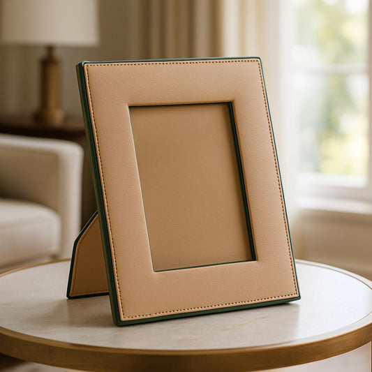 Beige Faux Leather Large Serving Tray With Wooden Handle