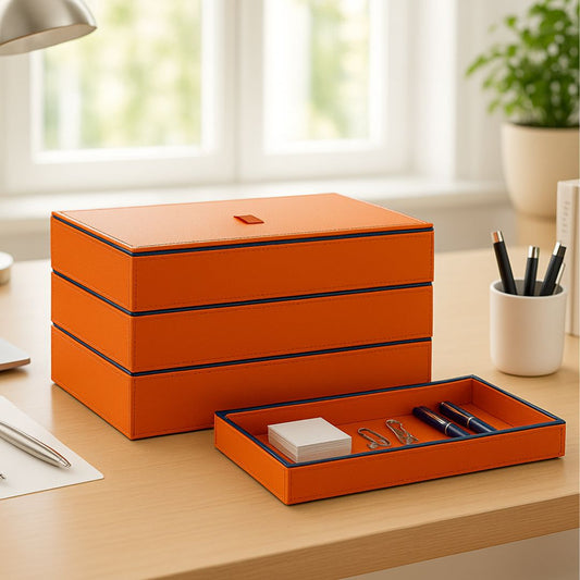 Orange Faux Leather Set of 3 Stack Tray With Lid