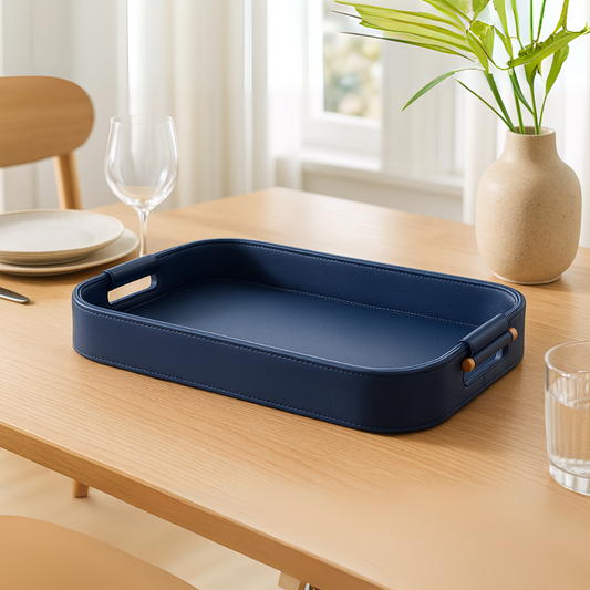 Blue Faux Leather Large Serving Tray With Wooden Handle