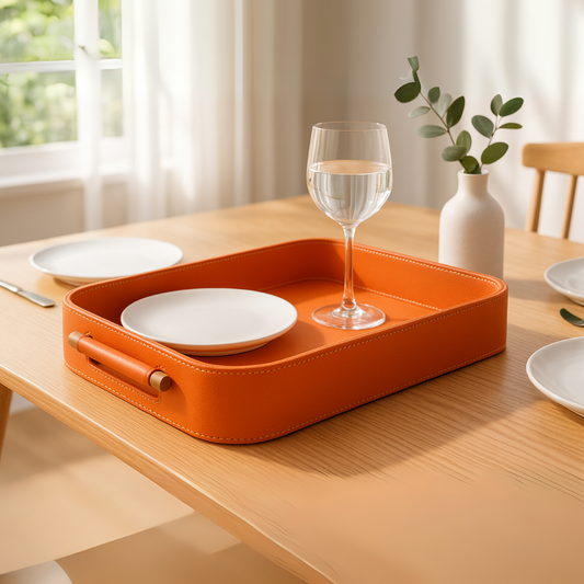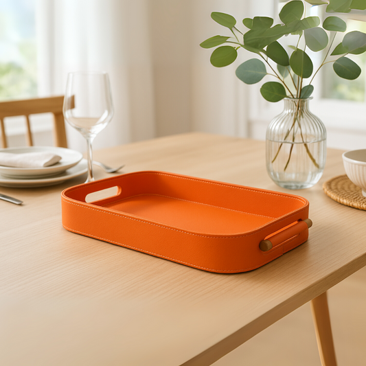 Orange Faux Leather Large Serving Tray With Wooden Handle