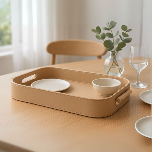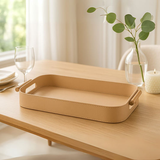 Beige Faux Leather Large Serving Tray With Wooden Handle