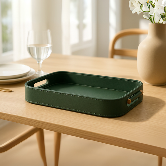 Green Faux Leather Large Serving Tray With Wooden Handle