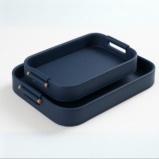 Hand Crafted Faux Leather Set of 2 Trays With Wooden Handle (Blue)