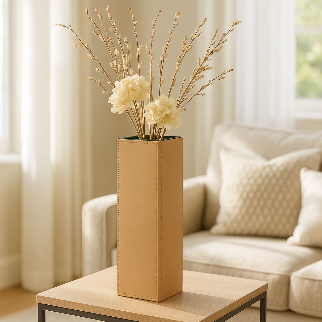 Beige Faux Leather Large Vertical Flower Vase - Bring nature indoors with timeless elegance and artisanal craftsmanship.